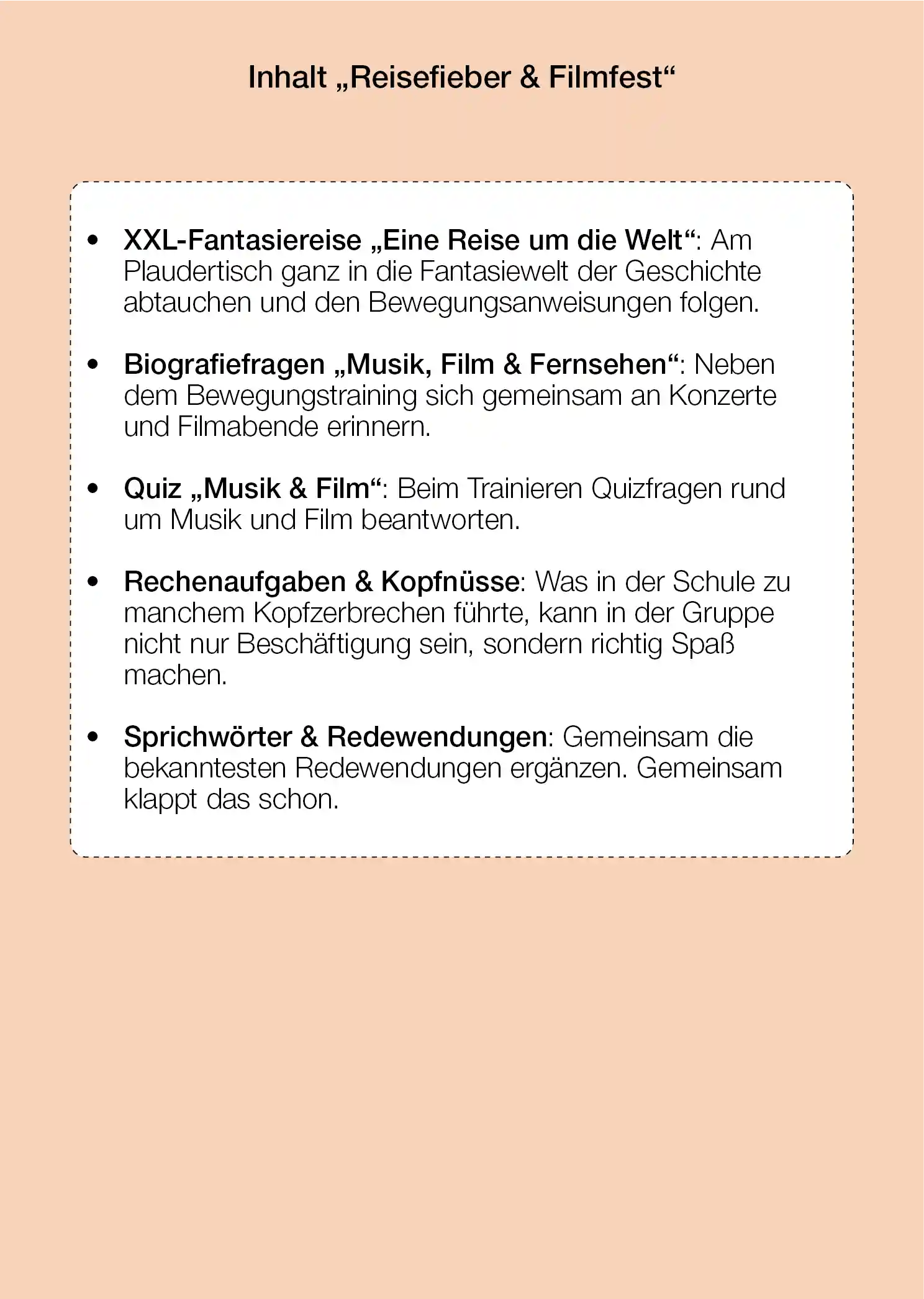 Mit dem Aktivierungsset „Reisefieber & Filmfest“ erhalten Sie Aufgaben rund um die unterschiedlichsten Freizeitbeschäftigungen. In der XXL-Fantasie- und Bewegungsreise unternehmen Sie gemeinsam einen Trip um die Welt und erkunden zusammen ferne Länder.